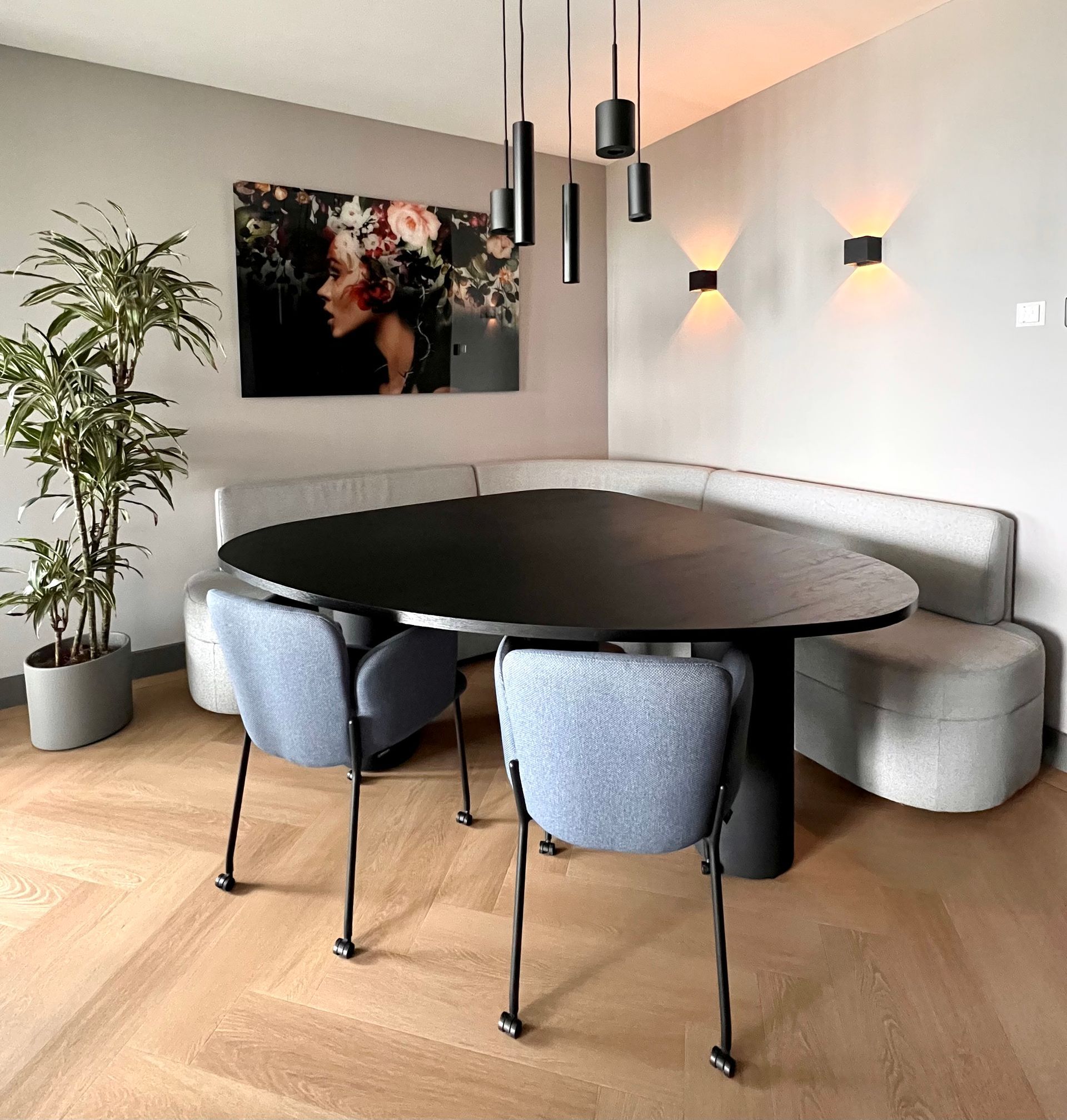 Op maat gemaakte eethoek, perfect passend in de hoek.